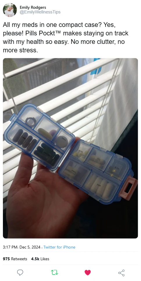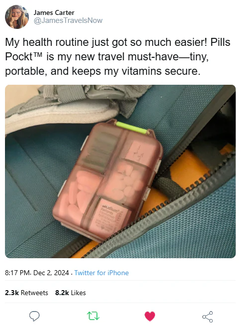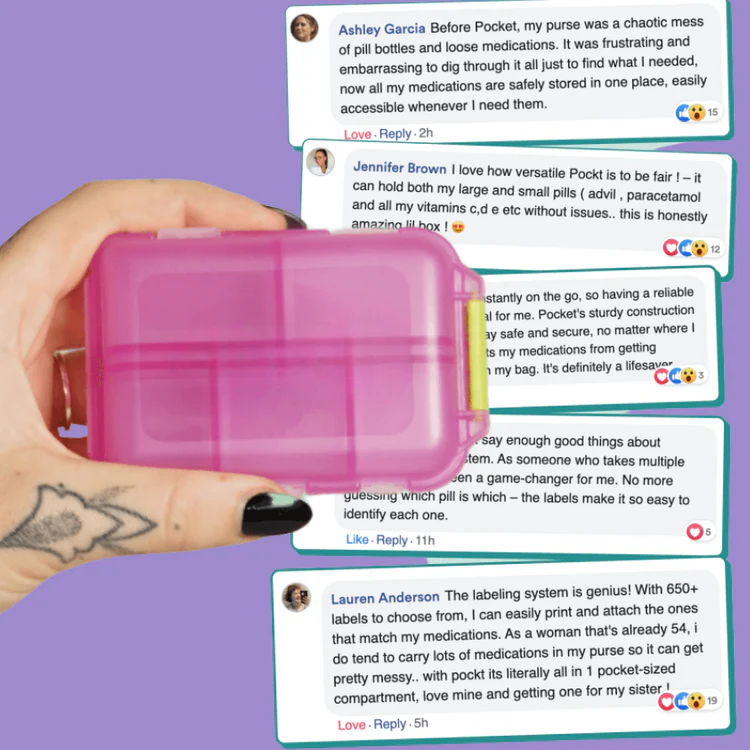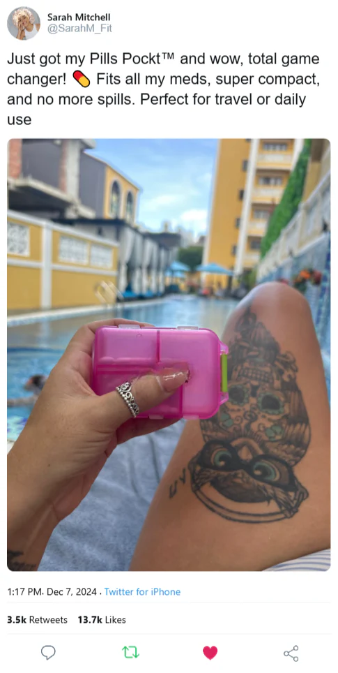 Keep your vitamins, medication, or supplements organized and accessible with Pills Pockt™ . Sleek, portable, and easy to use, it’s the perfect travel companion. Whether at work, on vacation, or running errands, stay consistent with your health goals anytime, anywhere.